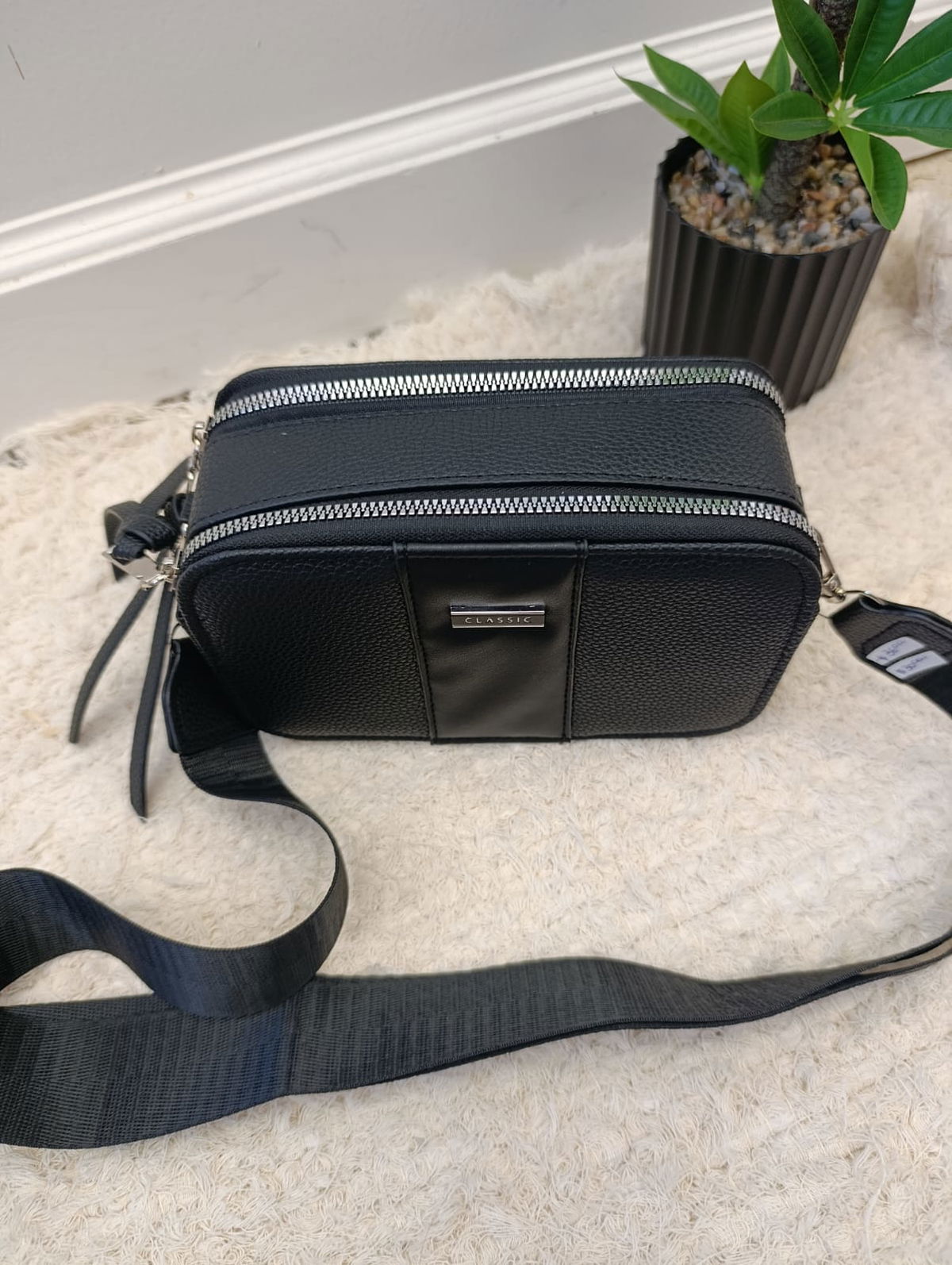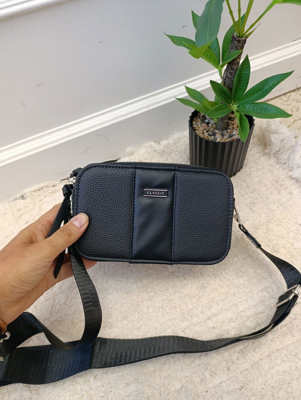 Pequeña, rigida, dos cierres, contiene correa regulable