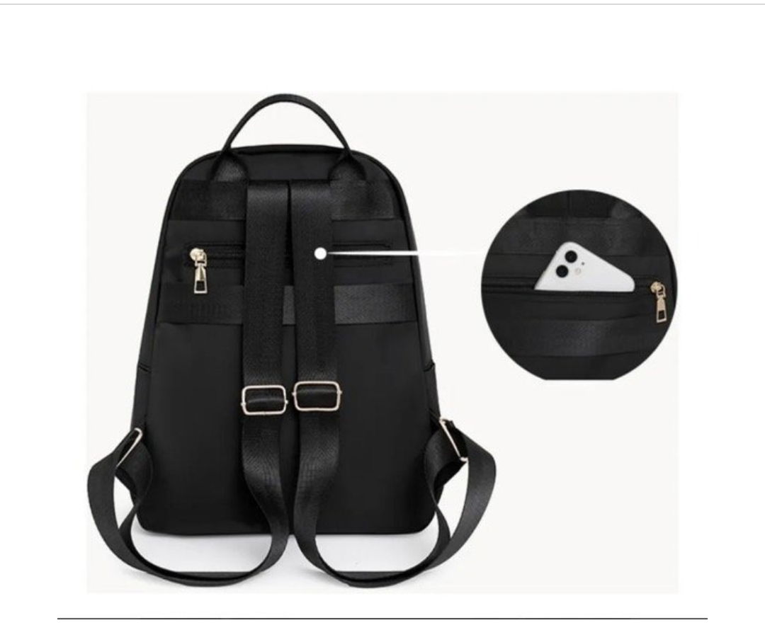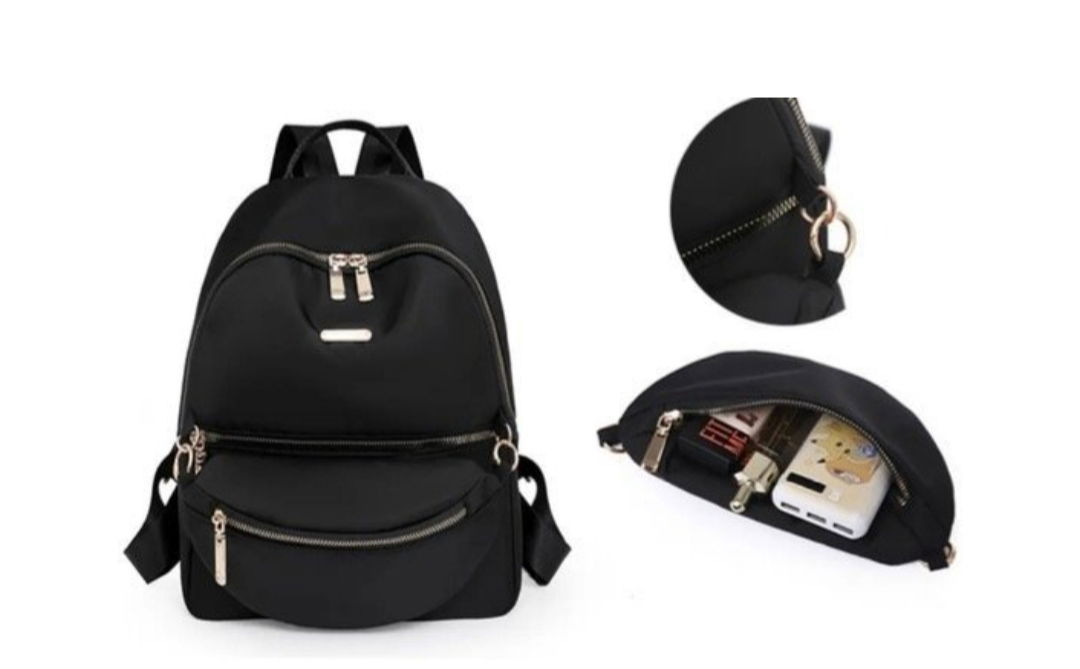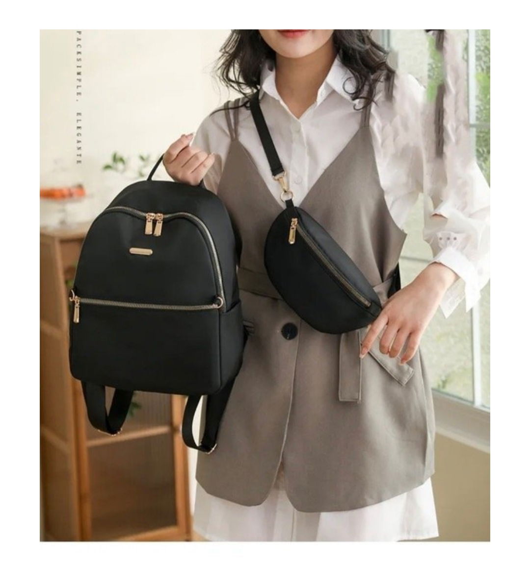 Mochila de tela con detalles en dorado, y riñonera.