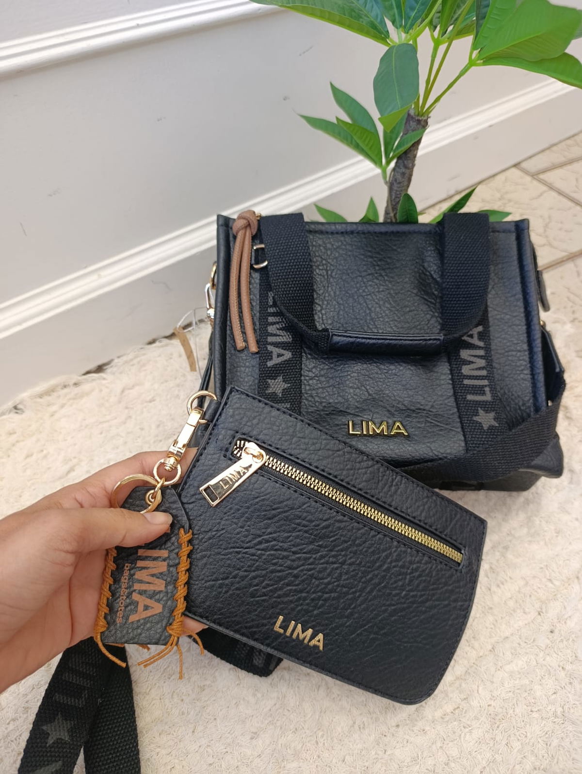 Detalle en el exterior, correas decorasas con la marca, detalles en dorado, contiene monedero con detalles.