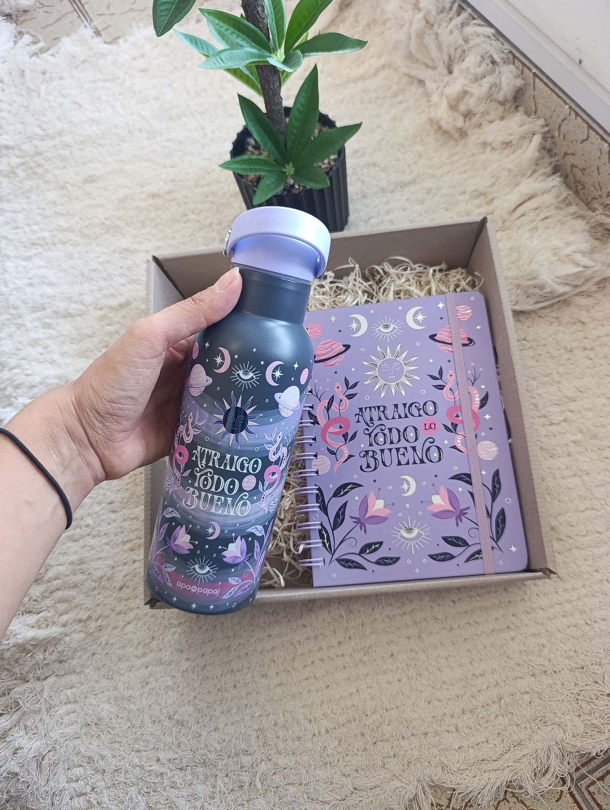 ✨Cuaderno A5, botella térmica de 500 ml, imcluye tapa con manija colgante y pico retractil con sorbete para tomar de forma practica y comoda.